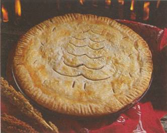 Prepare the dough and chill for 30 minutes. Roll out 2/3 of the dough and use it to line pie pan. Add the filling. Brush the top edge of the bottom crust with egg glaze. Roll out the remaining dough to make a top crust, and place over filling. Seal. Brush top with egg yolk. Use dough scraps to decorate the top. Make several decorative slashes in top to allow the steam to escape. (See photo.) Bake the 'tourtière' in a preheated 375 degree Fahrenheit oven for 40 to 50 minutes or until the crust is nicely browned. Cut the 'tourtière' in wedges and serve hot. The traditional accompaniments are green tomato chutney, piccalilli, cranberry relish, or chili sauce. |
