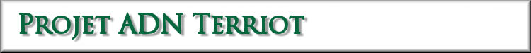 Ègalement, nous aimerons trouver n'importe quel descendant de Jehan, le frère mystérieux de Claude et de Germain, qui a été également énuméré dans le recensement de 1671 mais n'étais pas présents. Les liens avec les TERRIOTs (et variantes) qui habite aujourd'hui en France sont une possibilité distincte, et seraient bienvenus. Nous voulons également explorer la parenté, le cas échéant, avec la ligne de THERIAULT dit Grandmaison au Québec. Aussi, nous espérons de rendre facile pour n'importe qui, pour trouver et montrer une parenté de TERRIOT dans leur ligne masculine. Toutes les petites mutations feront possible les distinction des diverses branches. Avec plus de participants au projet d'ADN de nom de famille Terriot, nous allons pouvoir identifié le moment même où ces mutations se sont produites la première fois. Un autre projet